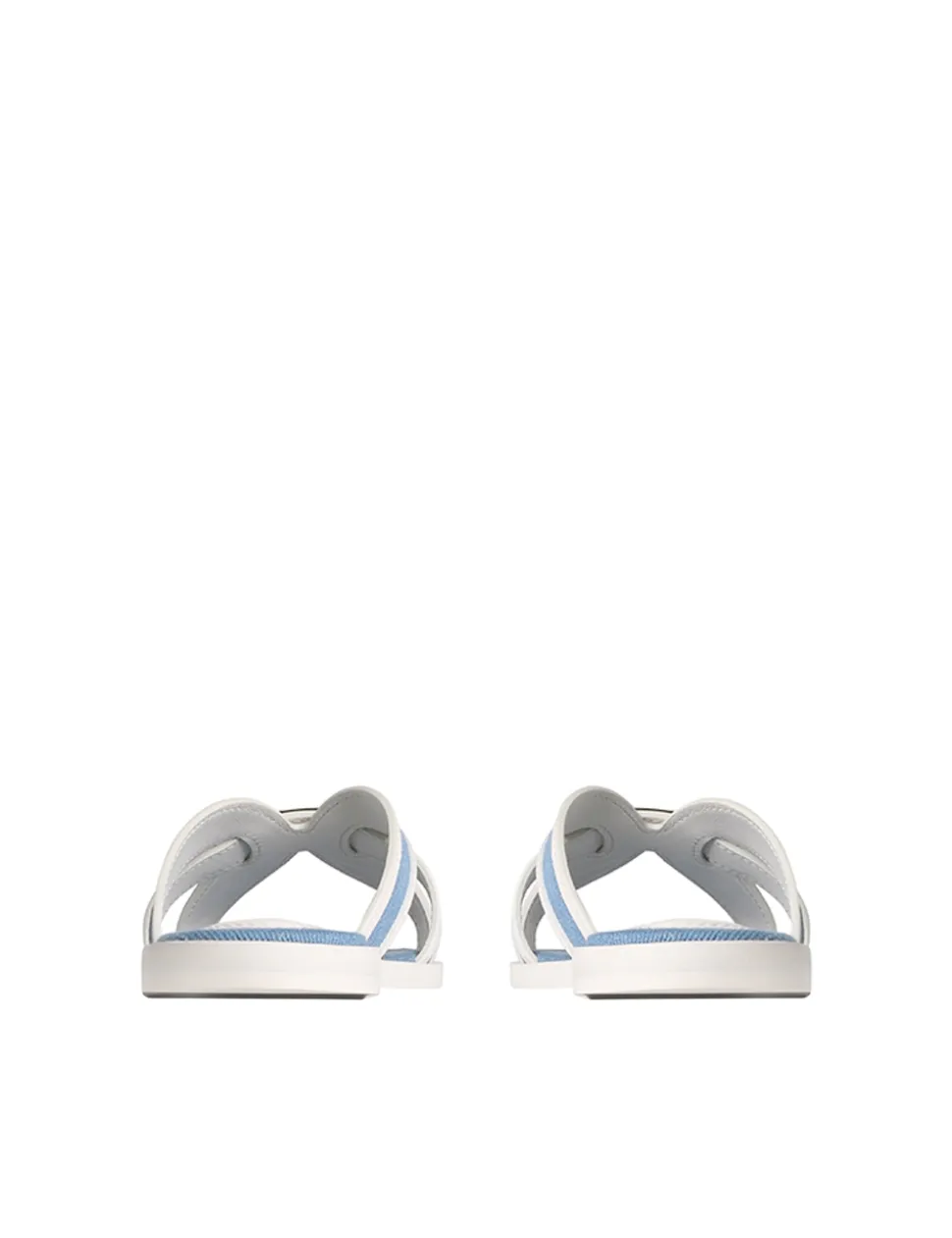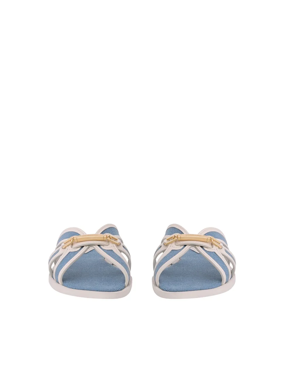 The Zimmermann Prisma Slide in Denim from our Spring 2024 Collection, Natura. A leather slide sandal featuring contrast denim throughout and ZIMMERMANN branded hardware.